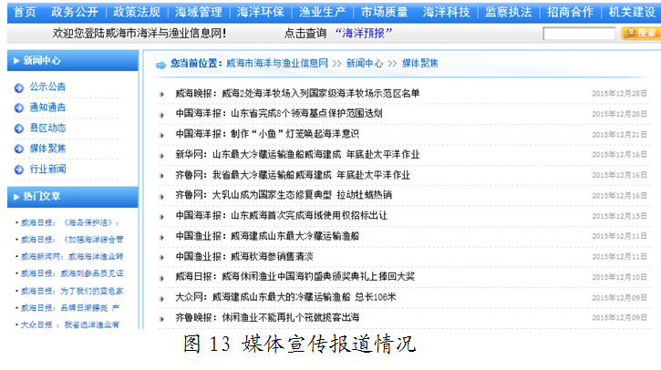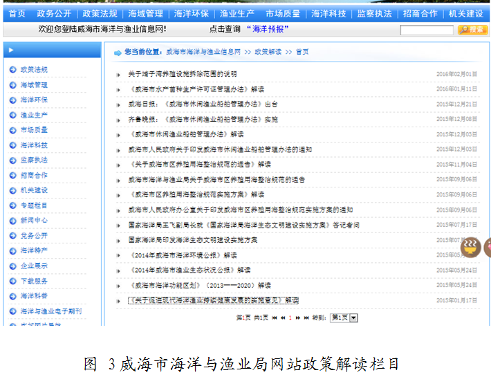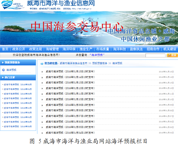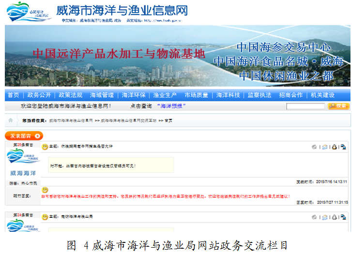 (二)主动回应社会关切,促进舆情稳定。一是8月3日,发现中国渔业政务网站一篇某省份关于“黄渤海伏季休渔结束连云港千余艘渔船开海捕鱼”的失实报道后,及时撰写澄清材料,通过电子邮件方式联系农业部渔业渔政管理局及时撤稿,避免了公众对国家休渔政策和渔区管理制度的误解,确保了休渔秩序的稳定。二是通过威海市海洋与渔业局网站政务交流栏目收取12位群众对海洋与渔业的意见与建议,及时进行了回复,帮助群众了解现状、解除疑惑、获得理解,有效提高了政府公信力。三是根据群众反映和生产生活需要,在威海市海洋与渔业局网站增设海洋预报栏目,及时发布海洋水温、风浪等技术信息,提高了服务质量,收到良好的社会反响,每天有近百名群众浏览海洋预报相关信息。
