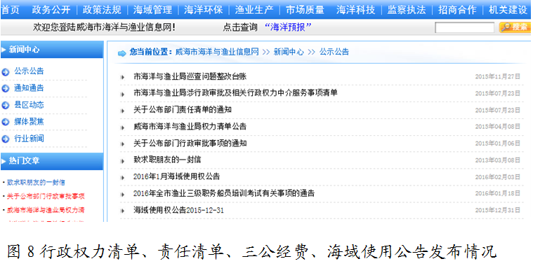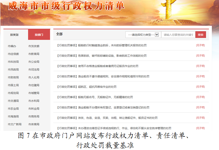 (一)通过政府信息公开完善管理监督机制。通过威海市海洋与渔业局网站、市政府门户网站等,面向社会公开权力清单、责任清单、海洋与渔业行政处罚自由裁量权基准、办事指南,通过威海市海洋与渔业局网站公布了机构预算、决算,主动接受社会各界,特别是管理服务对象的监督, 增强了约束刚性,从源头上避免了处罚的随意性,为确保行政处罚的公平、公正、合理奠定了坚实的基础。