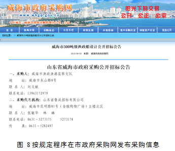 (二)认真落实政府采购信息公开制度。落实政府采购预算执行和采购结果全过程信息公开制度,按市财政局、市政府采购办要求,通过市政府采购网及时发布《威海市300吨级渔政船设计公开招标公告》、《威海市300吨级渔政船设计成交公告》、《威海市渔政渔港监察支队船只维修定点采购需求公示》、《威海市渔政渔港监察支队船只维修定点采购项目单一来源采购公示》、《威海市渔政渔港监察支队渔政船建造采购需求公示》、《威海市渔政渔港监察支队渔政船建造监理采购需求公示》,通过公开、公平、公正的竞争性谈判,确定渔政船坞修厂家和费用、300吨级渔政执法船设计厂家。单位所属两艘渔政执法船均已顺利确定坞修厂家、签订坞修合同并进厂坞修, 300吨级渔政执法船建造厂家和监理单位招标预计将于2016年1月举行。