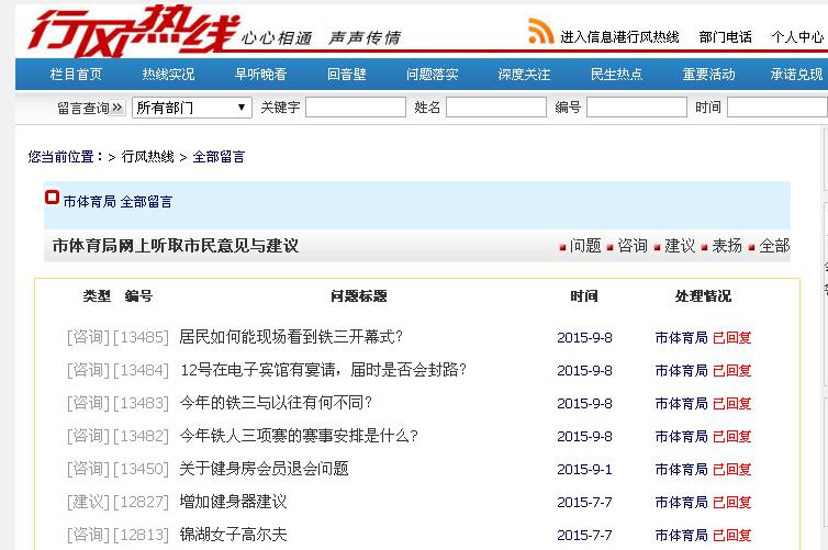2015年,威海市体育局认真贯彻落实《条例》和《办法》,政府信息公开工作扎实推进。在政府信息公开渠道拓展上,依托政府部门网站和《体坛纵横》,进一步完善了信息发布与政务公开一体的服务平台,通过腾讯政务微博、威海铁人三项赛等微信公众号,拓宽政府信息公开的渠道;在政府信息公开方面,主动公开与群众咨询公开相结合,不断强化信息公开的“全面度”,着力提高体育机关行政透明度和办事效率,服务群众需要;在制度建设上,继续完善各种制度规章,依法、按时公开各种政府信息,促进政府机关依法行政,全面接受社会监督。全年,通过“中国・威海”政府网站信息公开平台、威海体育网站以及各级新闻媒体、档案馆、公告栏、腾讯微博、山东省体育局微博等多种形式,发布各类体育政策法规、办事指南、业务工作等信息上千条,及时、全面、有效地主动公开政府信息,积极受理和回复向我单位提出的信息咨询,为广大公众提供了比较好的政府信息公开服务。