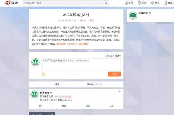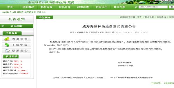2015年,全年主动公开政府信息338条。通过“中国・威海”政府网站部门信息公开平台、新闻媒体、林业局网站、公告栏、微博微信等公开渠道,实现了政府信息及时、全面、有效的公开。