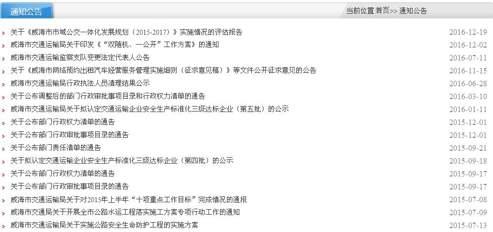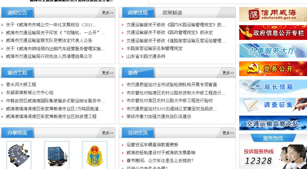 (三)进一步拓宽交流渠道。2016年11月,我局继续完善更新门户网站,界面更丰富,栏目设置更清晰,并增加了“政策解读”、“督查”等新栏目,增加了指向“信用威海”、“政府信息公开专栏”、“办事服务大厅“、“交通运输监察支队”“规划计划“、”统计数据”、“财政预决算”、“权力清单”、“年度工作报告”等网址的链接。
