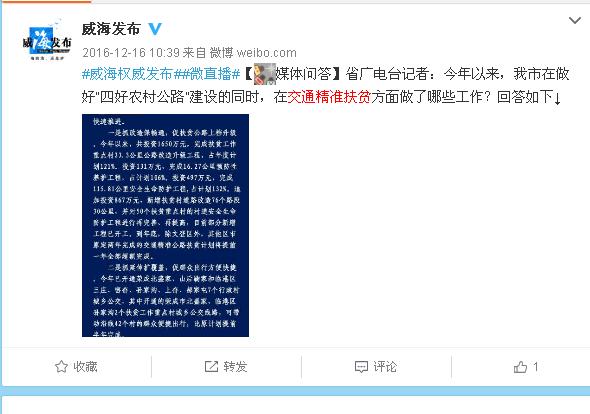 2016年6月27日,我局参与由威海市人民政府新闻办公室、威海网共同打造的威海发布微访谈栏目,市农村公路养护管理处主任刘维强、工程师于立勇就交通精准扶贫相关问题与网友在线交流。