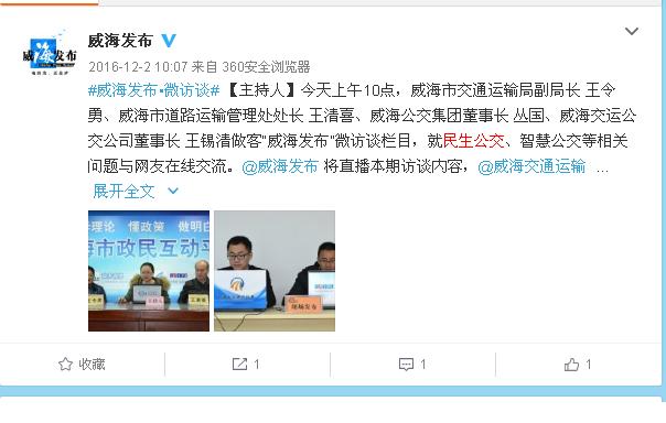 12月2日,副局长王令勇、市道路运输管理处处长王清喜、公交集团董事长丛国、交运公交公司董事长王锡清在“威海发布”微访谈栏目,就民生公交、智慧公交等相关问题与网友在线交流,2次微访谈共发布了16条信息。