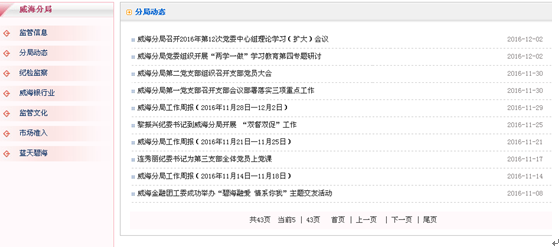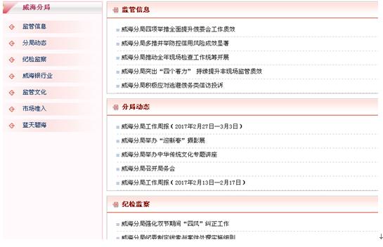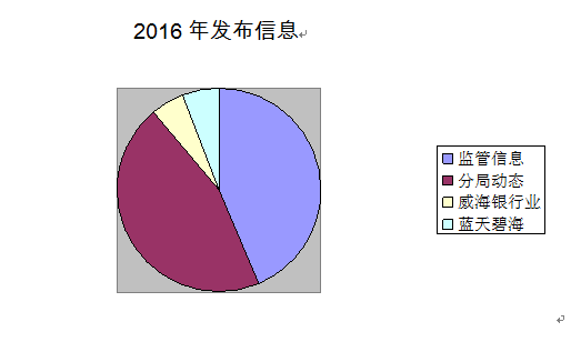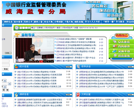 (一)强化政府信息公开平台建设。一是充分利用分局在中国•威海政府网站上的政务信息公开专栏,及时更新政策法规,定期公开威海辖内银行业运行情况,进一步扩大信息公开范围,丰富公开载体。2016年,共在政府网站上公布信息37条。二是利用办公区域显示屏、公告栏等平台,公布监管法规政策、监管机构职责、管理事项、办事指南等事项,切实提高监管工作透明度。三是利用威海银监分局官方网站载体,及时发布辖区威海辖内监管信息、分局动态信息、银行业新闻动态等信息,做好对内公开。四是做好行政许可事项公开。统一在威海银监分局内部网站及时公开发布分局行政许可事项,全年共公开行政许可事项59项。