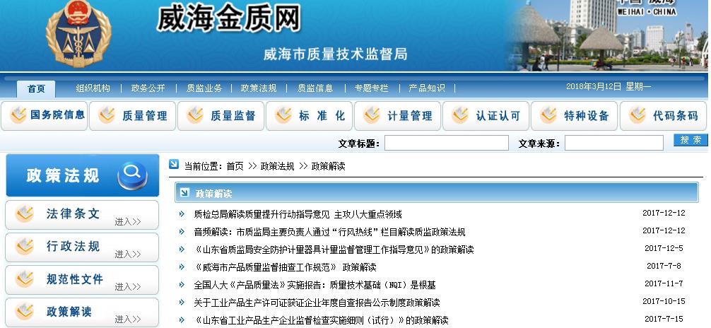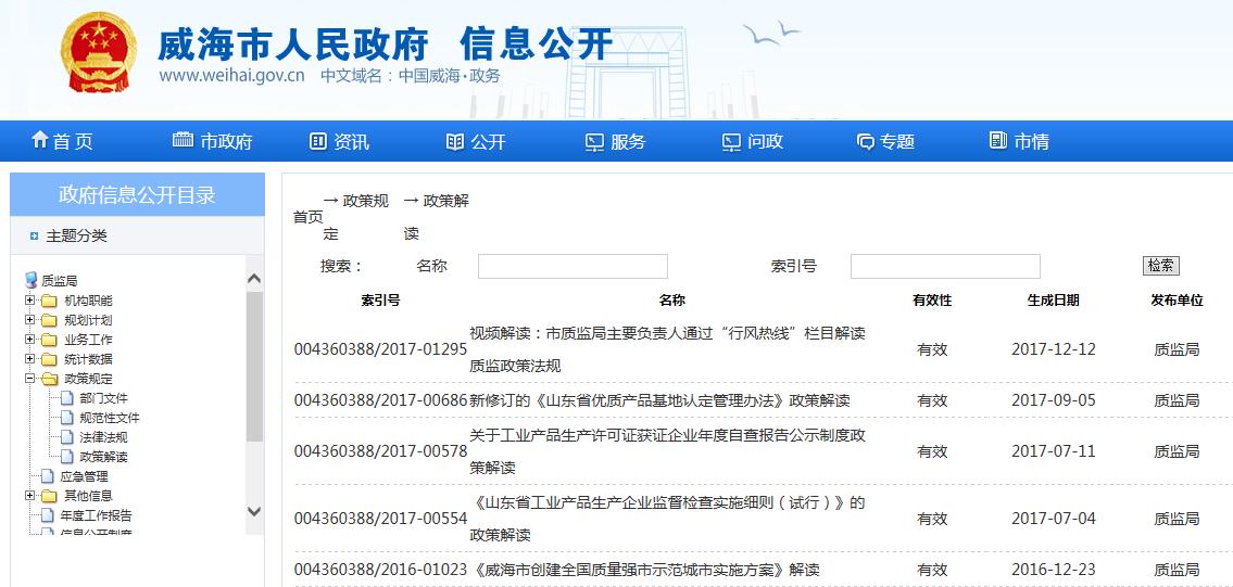 根据《威海市质量技术监督局政府信息公开政策解读制度》的规定,统筹运用“中国威海”网站信息公开平台、市质监局门户网站、新闻媒体、政务微信、微博等方式,结合质监工作实际,认真做好相关政策法规的解读。建立政策文件和解读方案一并报批制度,建立政策解读专家库,在部门网站“威海金质网”和“中国威海”信息公开专栏部门节点中设置政策解读栏目,及时发布解读内容,提高社会公众对质监工作和质量政策的知晓度,加深公众对政府行为的理解,增强政府行为的科学性、合理性,进一步提升政府信息公开实效。