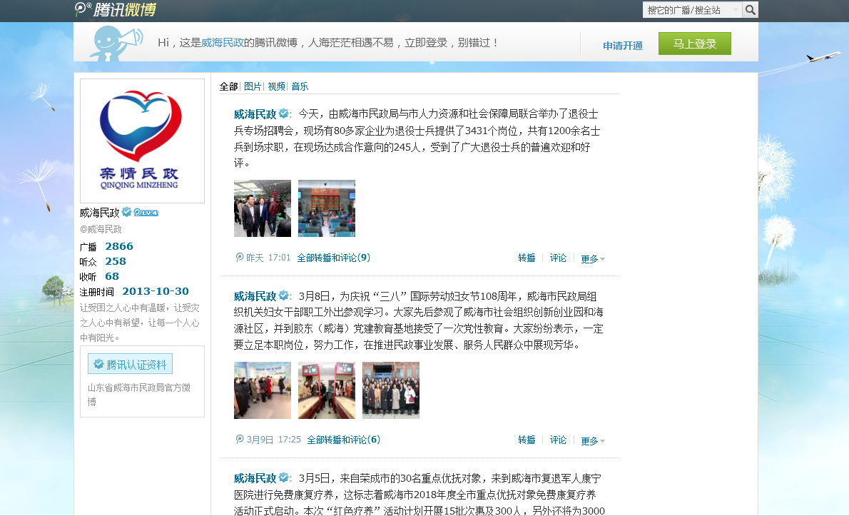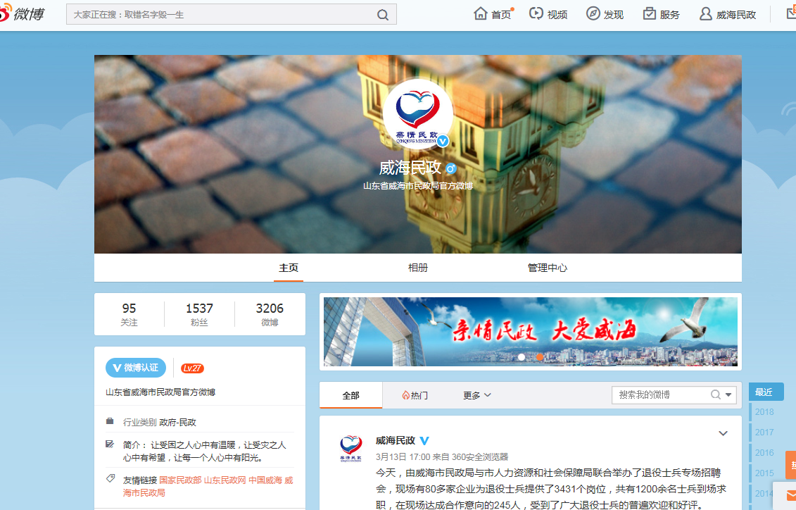 以媒体和网站为媒介发布相关信息,针对2017年主要工作的进展情况作详细解读,并及时准确地回复群众通过网站和电话咨询的问题。通过民政官方网站、微博、微信播发我市民政信息和政策解读等内容。目前,微博已发展粉丝听众1795名,发表微博6072条,其中新浪微博3206条,腾讯微博2866条,原创共869条,被“山东民政”、“威海发布”等转发原创微博118余条,回复公众咨询112次,全面提高了我市民政工作的知晓度。做客“威海发布”微访谈栏目,就社会福利、慈善救助、殡葬服务等群众关心的问题通过微博与网友进行互动,在线解答。通过热线电话、网站等方式及时回答公众咨询的各类问题,全年共受理和答复政府信息公开咨询1210人次,其中电话咨询870人次,网上咨询340人次。