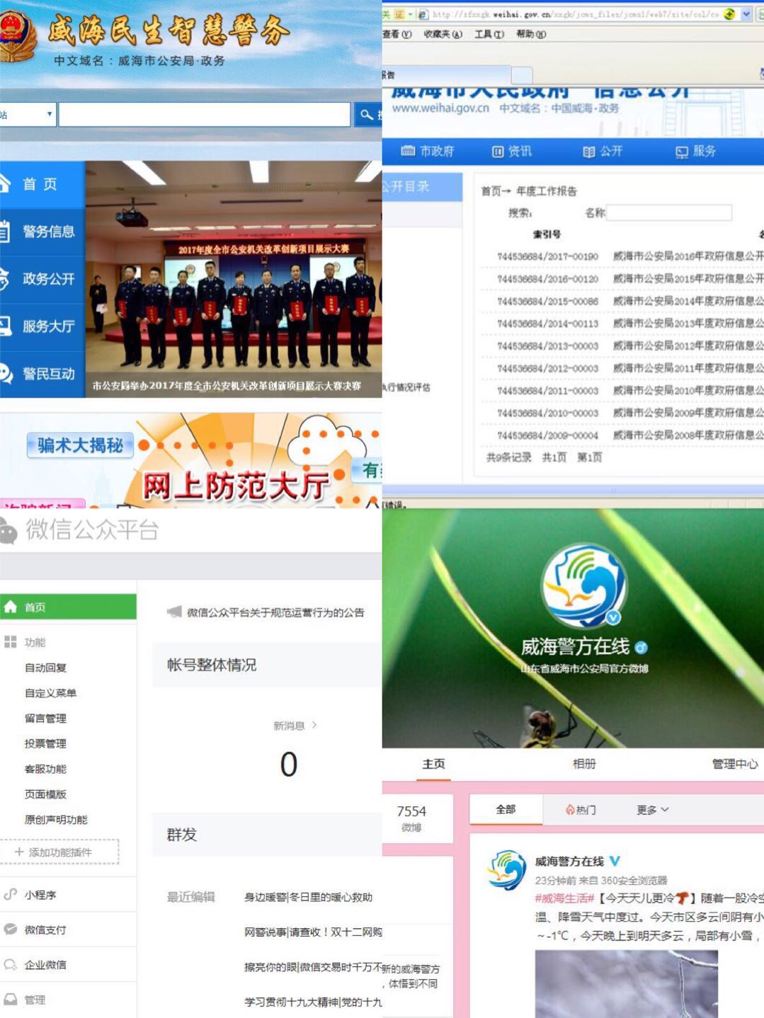 2017年,通过威海市政府网站、威海市公安局门户网站、威海市公安局政务微博、政务微信及公安机关业务服务大厅的公告栏、电子显示屏等,发布各类法律法规、办事指南等服务信息26800多条;通过热线平台信箱受理和回复居民咨询、投诉举报和意见建议4280余条,公安机关行政工作中形成的政府信息得到了及时、全面、有效的公开。