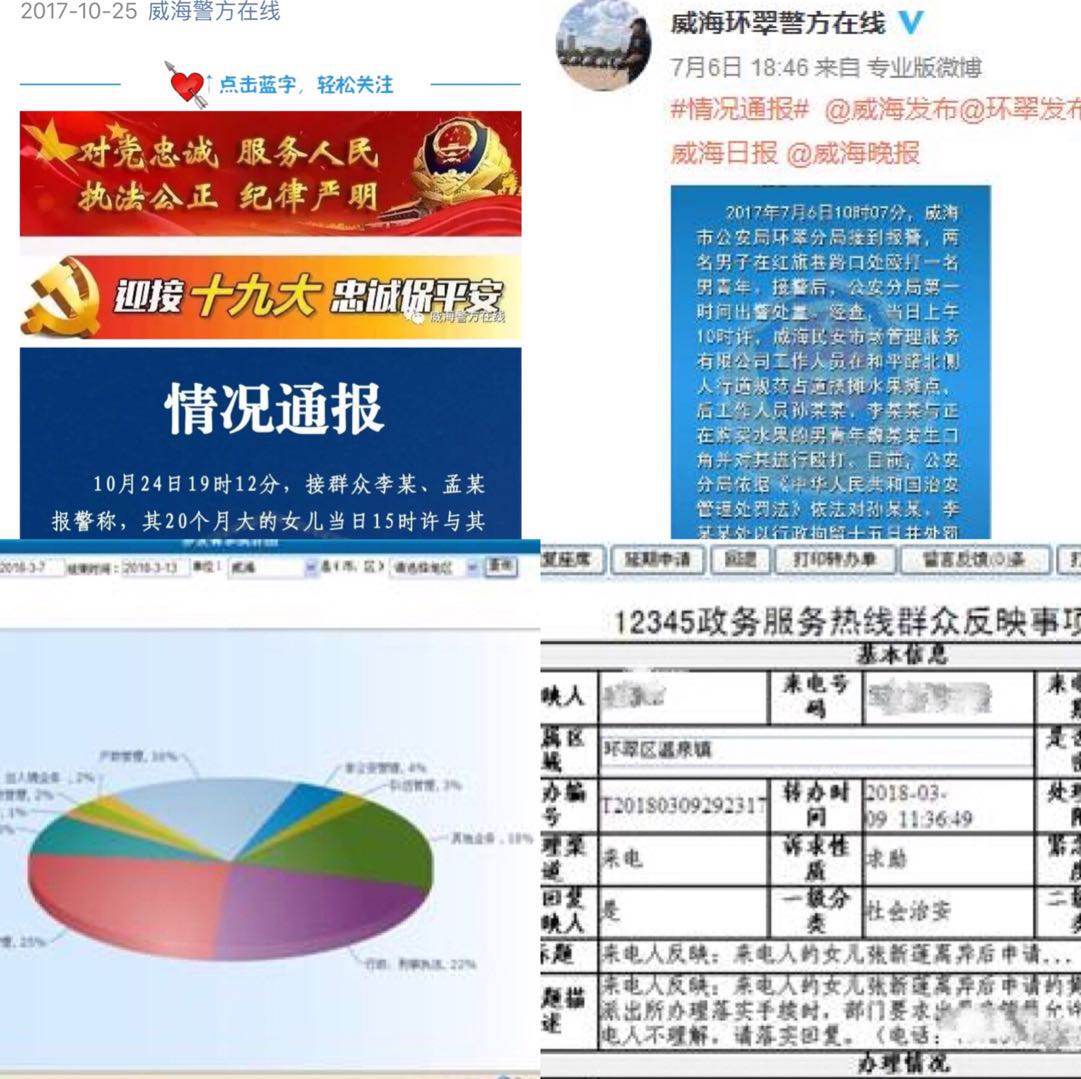 (二)拓展发布平台、丰富完善载体,群众获取信息的渠道更加畅通。充分利用威海市政府网站、威海市公安局智慧网站、威海警方在线微博、威海警方在线微信公众平台主动发布公安行政工作信息,保证公众对公安工作的知情权;充分发挥12345热线、行风热线、9600110热线、民生警务平台等平台的作用,为群众提供政策咨询、监督投诉等服务,解答群众提出的问题,保障群众的权益,维护群众的利益;充分利用“互联网+”提升工作效率,开展网上预约和线上审批服务,群众到公安机关办事更加方便快捷。