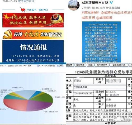 (三)积极回应社会关切、主动公开舆情信息,由舆情引发的连锁效应大幅度降低。2017年,通过政务微博、微信及媒体等渠道先后对“城管打人”事件舆情、女孩失踪舆情等进行即时回应,公布事件真相,澄清不实传闻;通过威海市公安局智慧网站、政务微博、政务微信、9600110民生警务热线及12345热线、市长热线信箱等渠道与公众进行互动交流,全年共进行交流互动6890人次。
