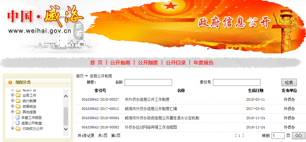 (三)推进落实情况。将信息公开工作细化分配到具体科室、单位,明确了主要任务、工作措施和节点目标,在日常每月调度信息公开情况的同时,每季度对相关任务落实情况进行督导检查,并将信息公开工作纳入《2017年威海市外侨办目标责任制考核办法》。