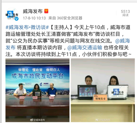 2017年我局充分利用网站、报刊、广播、电视、电子信息屏等媒体实施信息公开,认真处理通过信件、传真、电话、门户网局长信箱等方式收到的群众的各类咨询投诉问题。2017年8月10日,市道路运输管理处处长王清喜在“威海发布”微访谈栏目,就“公交为民办实事”等相关问题与网友在线交流,回答网友提出9条问题。