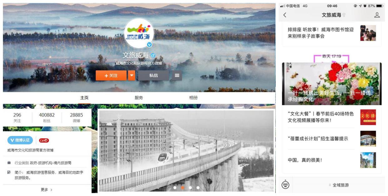 文化方面,2018年通过“中国•威海”政府网站信息公开平台发布信息涉及政策法规、规划计划、人事、业务工作、统计数据以及其他相关信息248条,通过威海市文化和旅游局(文化事业、文化产业)官方网站公开信息638条。微博发布重信息质量,重流程科学,重实时互动,对市民在微博平台上提出的疑问第一时间回复,“文化威海”政务微博、微信发布各类文化信息1200条(其中微博发布445条,微信发布755条),“文化威海”微平台影响力稳步提升。