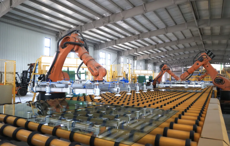 机器轰鸣,热浪扑面,走进威海中玻的浮法玻璃生产车间里,巨大的熔炉正在高温下熔化原料,大型自动化切割机精准地将玻璃切割成标准尺寸。进入包装区后,机械臂将其稳稳吸住,摆放至拖车上,等待发往全国各地。