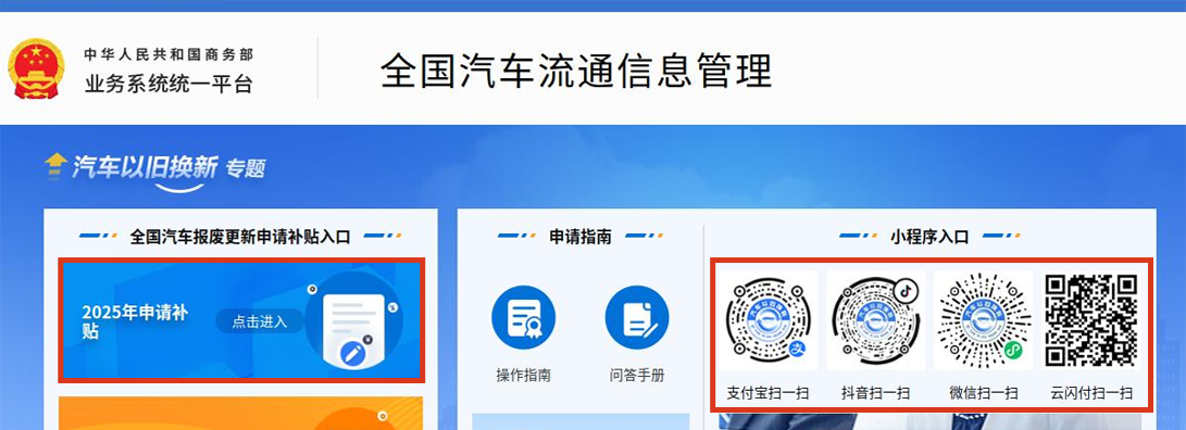 • *于2026年1月10日前,登录全国汽车流通信息管理系统网站(https://qclt.mofcom.gov.cn)或“汽车以旧换新”小程序(以下简称汽车报废更新平台)进行申报。