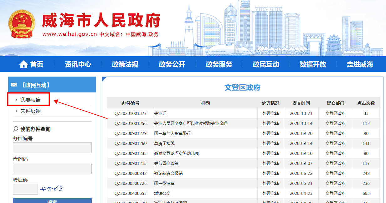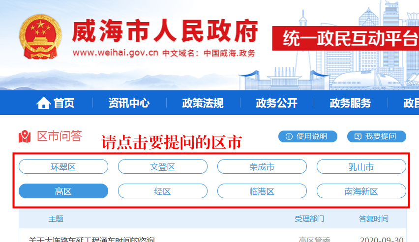 访问途径:威海市人民政府官网→政民互动→区市问答