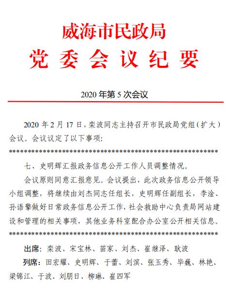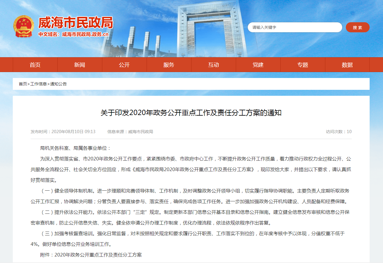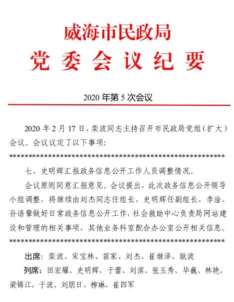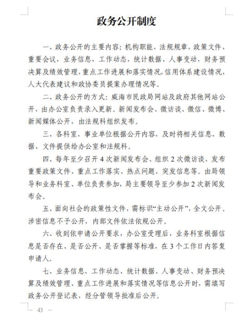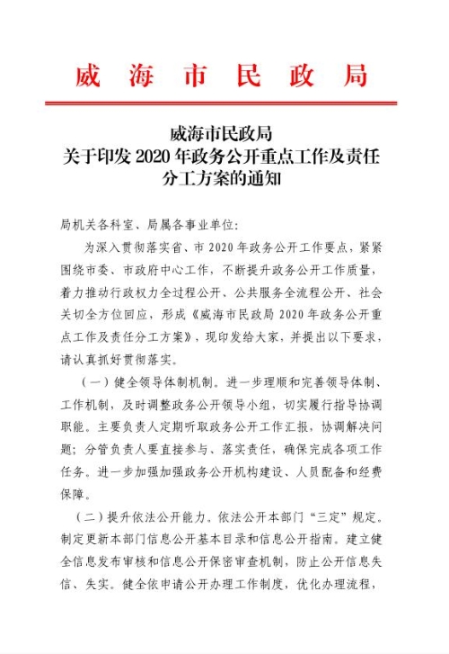 三是加强政府信息管理。(一)加强组织领导。认真落实省、市关于全面推进政务公开的决策部署,进一步理顺和完善领导体制、工作机制,根据机构改革后领导班子调整及分工变化情况,及时调整了政务公开工作领导小组,切实履行指导协调职能,为政务公开工作提供健全有力的组织保障。进一步加强政务公开机构建设、人员配备和经费保障,落实政务公开专兼职工作人员,明确工作职责、工作任务和工作要求。(二)健全工作制度。制定下发《威海市民政局2020年政务公开工作要点 》、《威海市民政局政务公开制度》等文件,建立健全信息发布审核和信息公开保密审查机制,防止公开信息失信、失实。健全依申请公开办理工作制度,优化办理流程,依法依规依程序作出答复。丰富政务公开工作内涵,拓展政务公开深度和广度,提升了政务公开工作标准化、规范化水平。