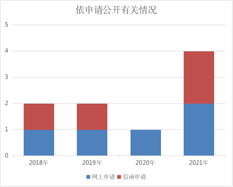 2.依申请公开。威海市民政局严格按照《中华人民共和国政府信息公开条例》做好依申请公开工作,严格做好依申请公开登记、审核、办理、答复及送达等各个环节工作,2021年,我局收到政府信息公开申请4件,比2020年增加3件,申请的内容主要涉及社会救助、区划地名等方面,其中网上申请2件,信函申请2件,均在法定时限内答复申请人,办结率100%。全年未发生因政府信息公开工作引发举报、投诉、申请行政复议或提起行政诉讼的情况。