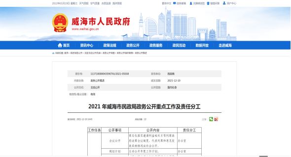 3.政府信息管理。一是加强组织领导。认真落实市政府关于推进政务公开工作决策部署,梳理完善政务公开工作机制,根据科室人员调整及分工情况,及时调整政务公开工作领导小组,切实履行职能为政务公开工作提供健全有力保障。二是健全工作制度,根据政务公开重点工作分解,制定《2021年威海市民政局政务公开重点工作及责任分工方案》,实现政务公开工作全周期管理。三是加强规范性文件管理。对现行有效的部门规范性文件进行了全面清理。目前保留的规范性文件19件、废止的规范性文件4件。