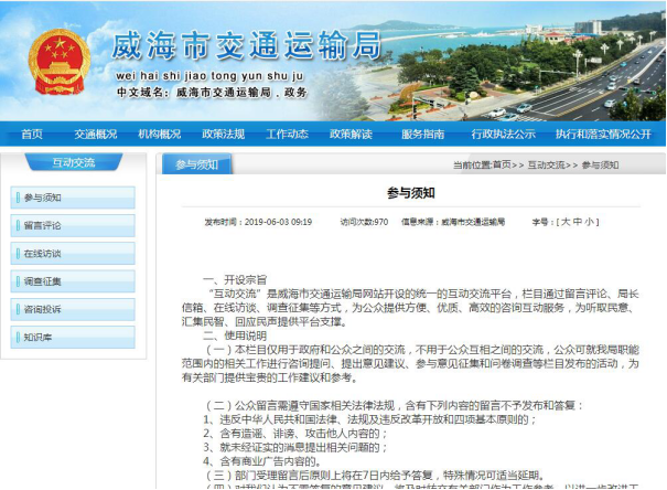 2019年我局充分利用网站、报刊、广播、电视、电子信息屏等媒体实施信息公开,认真处理通过信件、传真、电话、门户网局长信箱等方式收到的群众的各类咨询投诉问题。2019年7月18日,客运科科长孙俊生、公路科有关负责人王海桥在“威海发布”微访谈栏目,就“为民办实事”等相关问题与网友在线交流,回答网友提出11条问题。2019年10月11日,公路科科长张峻峣、齐鲁交通威海公司ETC客服中心办公室主任宋威萱将做客“学理论,懂政策,做明白人”微访谈栏目,就“ETC和四好农村路”的相关问题与网友在线交流,回答网友提出10条问题。