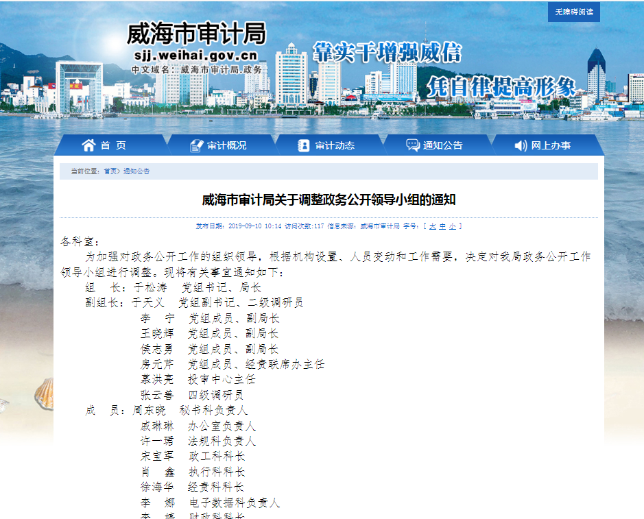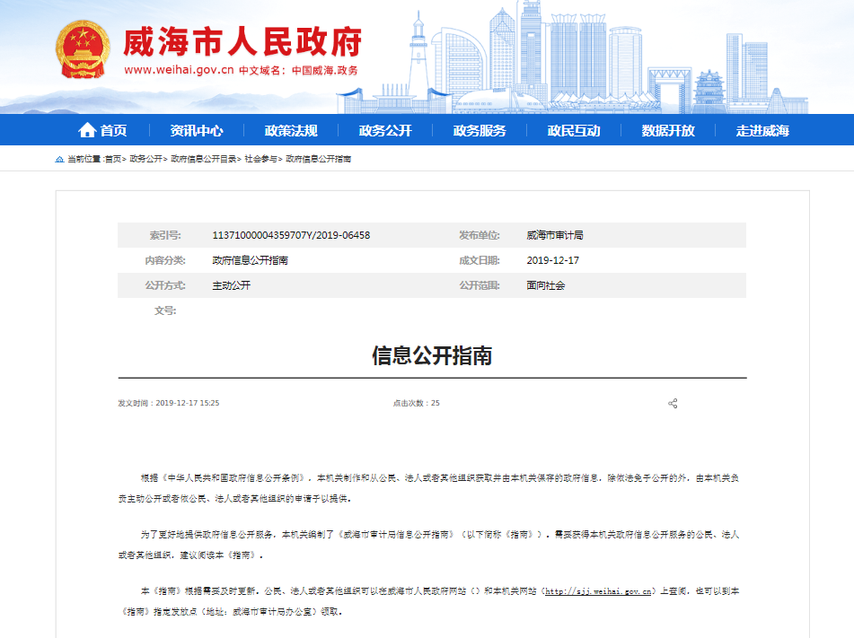 威海市审计局认真贯彻落实《条例》和《办法》以及2020年度各级政府印发的关于政府信息公开工作的相关文件精神,遵循“公开为常态、不公开为例外”的原则,建立健全工作运行机制,政府信息公开工作进一步规范,不断拓宽政府信息公开领域,深化和丰富政府信息公开内容。主要通过威海市人民政府网站和威海市审计局网站以及新闻媒体、档案馆、公告栏、政务微博、微信等多种形式,及时、全面、有效地主动公开政府信息,积极受理和回复政府信息公开申请,及时、全面公开政府信息,为广大公众提供了更加优质、便捷的信息服。