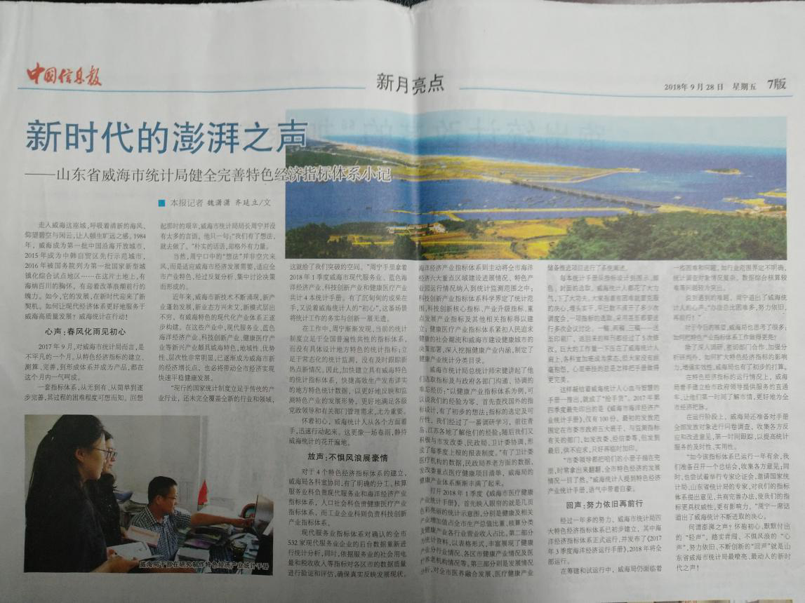 (二)强化统计分析信息工作。目前全局共撰写统计分析83篇,统计信息276篇,多篇被市委、两办及国家统计局网站、中国信息报、山东统计、威海日报、晚报等刊物采用。中国信息报在“新月亮点”版块刊登《新时代的澎湃之声--山东省威海市统计局健全完善特色经济指标体系小记》文章。