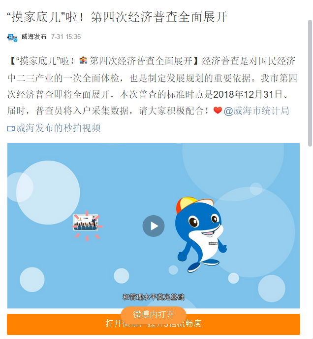 一是丰富宣传主体。坚持“分总结合,相互补充,提高效率”的原则,充分利用市场化竞争优势,通过购买服务的形式将四经普的宣传工作外包给广告公司,并将一个项目分成了两个标段进行招标,以保证宣传的效率和质量。5月底,通过招标确定了两家广告公司,目前两家公司合作顺利,平面广告、动画广告和经普吉祥物已全市投放。二是创新宣传方式。自主设计的《一张图读懂经济普查》、《经济普查小知识》等宣传资料,已在微信、微博和政府官网上投放,并以展架和易拉宝的形式在全市公共场所摆放。同时,组织人员佩戴普查宣传员标志在人流密集区(如威高广场、华联购物、九龙城、韩乐坊)发放传单,并鼓励群众支持统计工作。结合横幅标语、外墙广告、基层单位橱窗宣传、入户发放传单、出租车广告、高速公路广告牌等宣传形式,形成了全方位、立体式宣传格局。除传统宣传方式外,还突破性的设计制作了1分钟宣传动画片,将在全市公交车电视、电梯媒体和楼宇媒体上大量投放。经普吉祥物——小普,是威海市自主设计研发的卡通形象,以海豚的形象代表威海海洋经济,以群众喜闻乐见的动画形式,言简意赅又全面丰富地向群众介绍经济普查知识,极大地提高政府行为与群众生活的密切度。