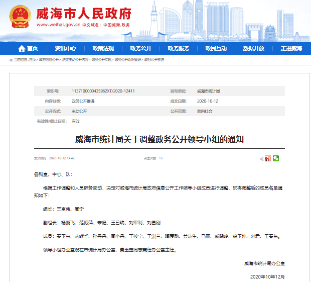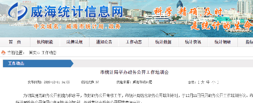 (1)加强组织领导,健全完善工作机制。及时调整市政务公开领导小组组成人员,形成了由主要负责人任组长,班子成员任副组长,各科室负责人任成员的组织领导体系,进一步明确工作目标,细化责任分工, 按照“内容完备、条目清晰、标准统一、责任明确”的原则,修订了威海市统计局政府信息公开目录及政务公开重点任务分工。