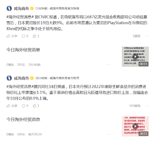 市商务局积极利用威海市人民政府网站和威海市商务局门户网站以及新闻媒体、政务微博、政务微信等新媒体及档案馆、图书馆等多种渠道和形式公开信息,在用好报纸、电视、网站等传统平台公开信息的基础上,又先后在抖音、头条等新媒体平台建设【海外经贸消息】等专栏,及时、全面、有效地公开政府信息。