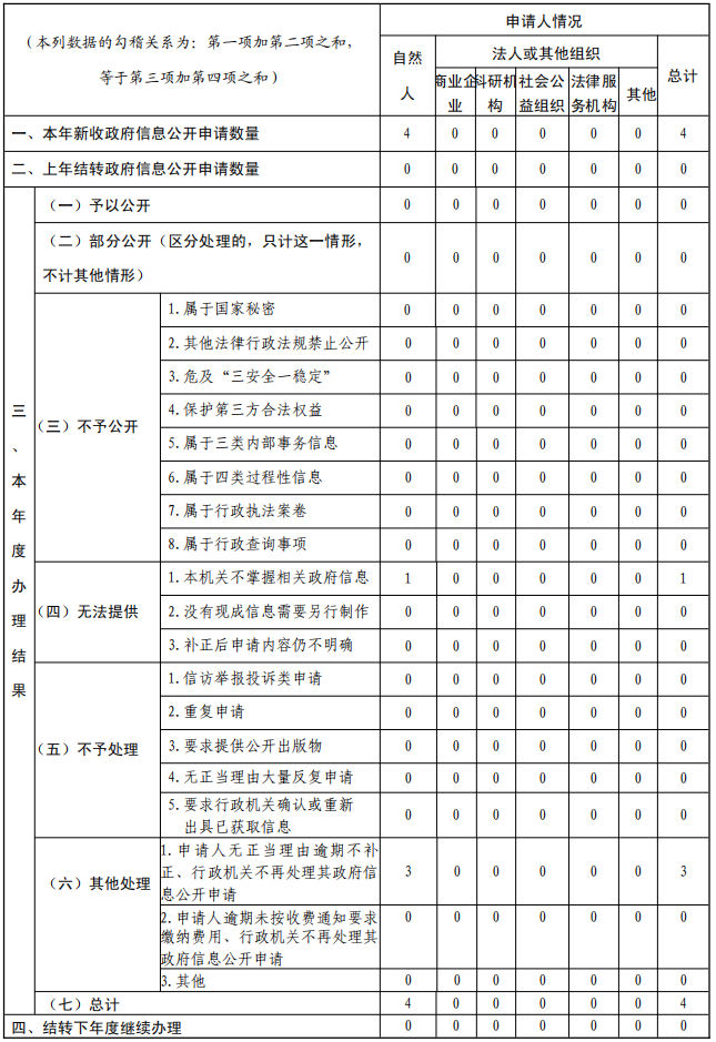 2.依申请公开方面。共收到线上提交的政府信息公开申请4件,均按期办结,未发生行政复议和行政诉讼案件。